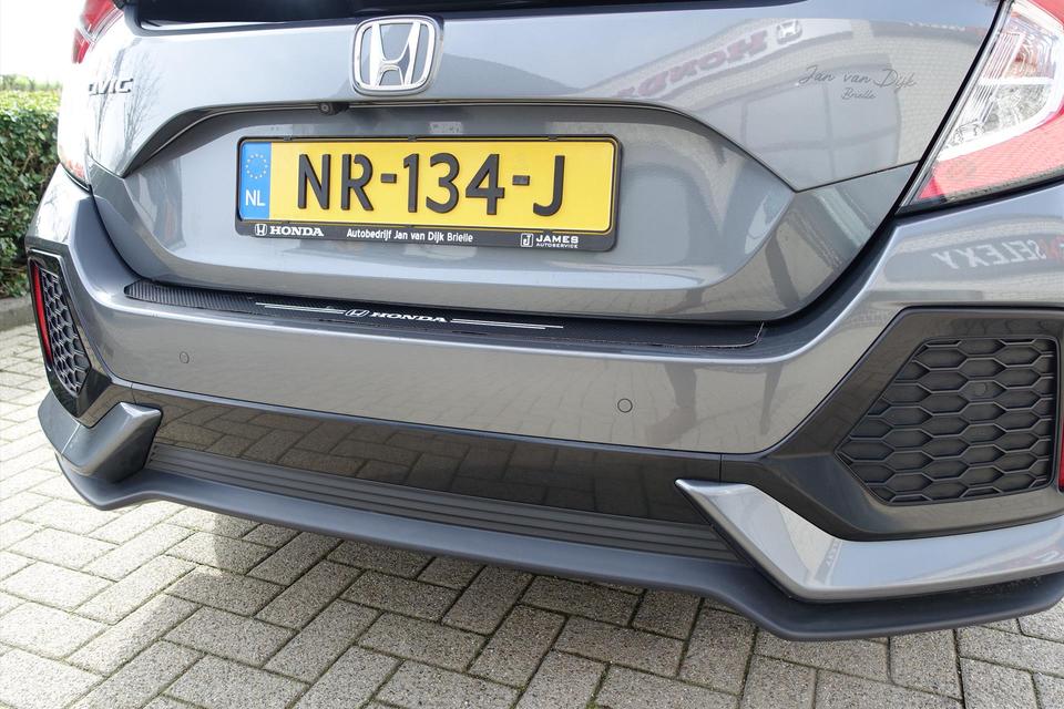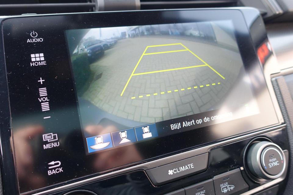 Zoals u mag verwachten van deze Honda Civic is hij uitgerust met een reeks aan actieve veiligheidssystemen. De actuele snelheidslimiet, een inhaalverbod en andere verkeersborden; de verkeersborddetectie ondersteunt u tijdens elke rit. Actieve dodehoekdetectie waarschuwt als een ander voertuig zich in uw dode hoek bevindt. Dit verkleint de kans op een aanrijding. Het risico van een kop-staartbotsing wordt aanzienlijk verminderd door de forward collision warning. De veiligheid van deze auto wordt verder verhoogd door hill start assist, rem-assistent en bandenspanningcontrolesysteem.